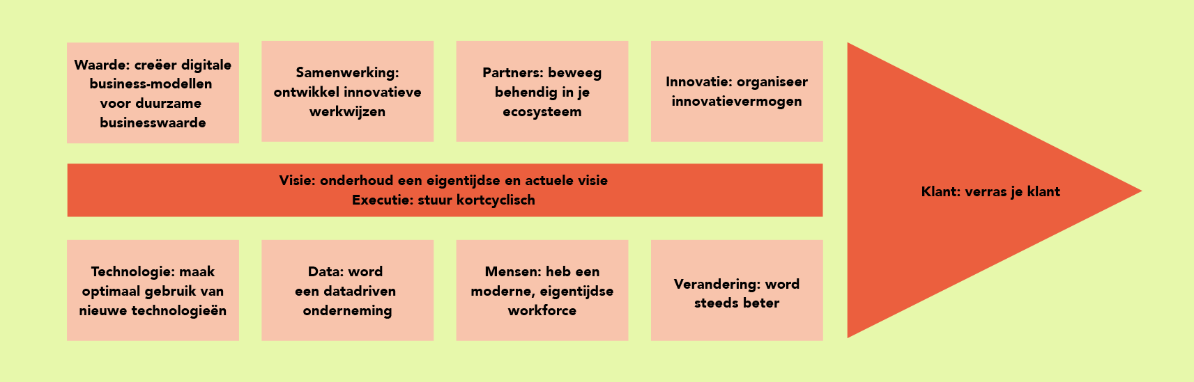 Een digitaal vruchtbare onderneming is wendbaar en heeft zich voldoende ontwikkeld op elf aspecten, niet noodzakelijk op elk gebied even ingrijpend. De opdracht is dus elfledig: