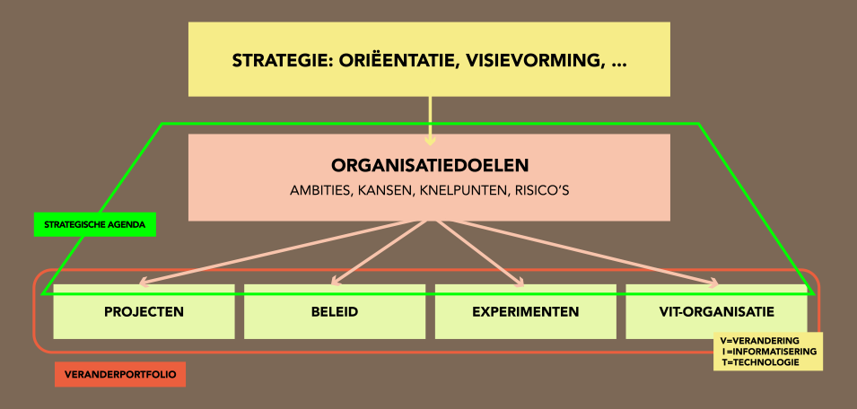 Veel organisaties zijn niet goed in executie, de veranderingen die het meest bijdragen aan de visie, krijgen vaak niet de prioriteit die ze verdienen. Analyse en visie zijn vaak erg abstract, te abstract en dan is het moeilijk te bepalen wat daar het meest aan bijdraagt. In de workshop strategische agenda in een dag stellen we met het managementteam in één dag de strategische veranderagenda vast. Eerst maken we visie concreter door de belangrijkste veranderthema’s te kiezen en een aantal concrete veranderambities, te benutten kansen, op te lossen knelpunten en te mitigeren risico’s te benoemen. Als we die hebben kunnen we vaststellen welke projecten we willen uitvoeren, waar we eerst beleid moeten definiëren, waar we eerst willen experimenteren en welke eisen dat stelt aan de manier waarop we verandering, informatisering en technologie organiseren. De workshop vergt geen voorbereiding van de deelnemers, maar nog wel een beetje nabewerking.